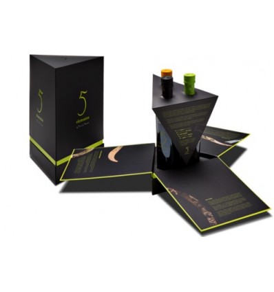 Original estuche de forma prisma triangular que integra de forma exclusiva los tres Aceites de Oliva Virgen Extra 500 ml de ‘5 elementos’ – Picual, Cornicabra DOP Montes de Toledo y Secret Blend Coupage.